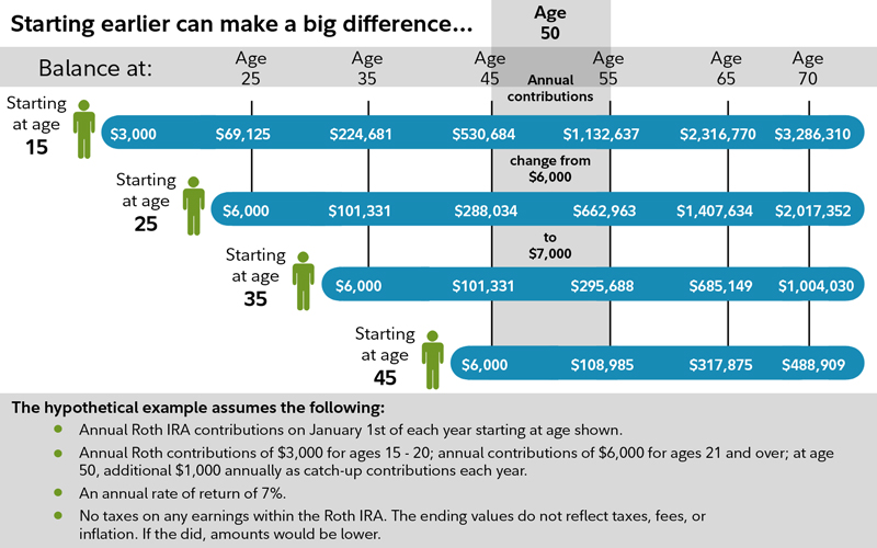Some companies allow you to open up a Roth IRA as early as 18 years old, and saving $250 per month will save over a million dollars by 65. This graphic shows how your money adds up: